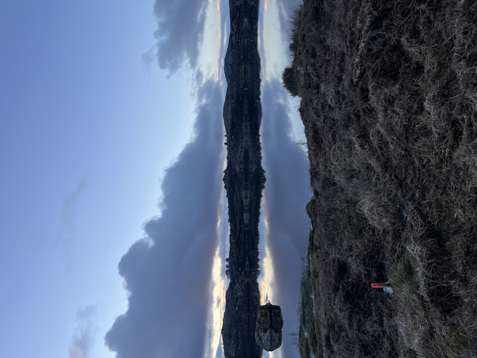 A still, reflective body of water mirrors a rugged, craggy land formation and cloudy sky. The land's edge is coarse with dry vegetation. The sky is overcast with heavy, grey clouds illuminated by a muted, possibly setting, sun. The water's surface is calm, producing a sharp, symmetrical reflection. A small, angular rock formation juts out from the water's surface. A red and white marker stands on the land's edge. The image orientation is vertical.