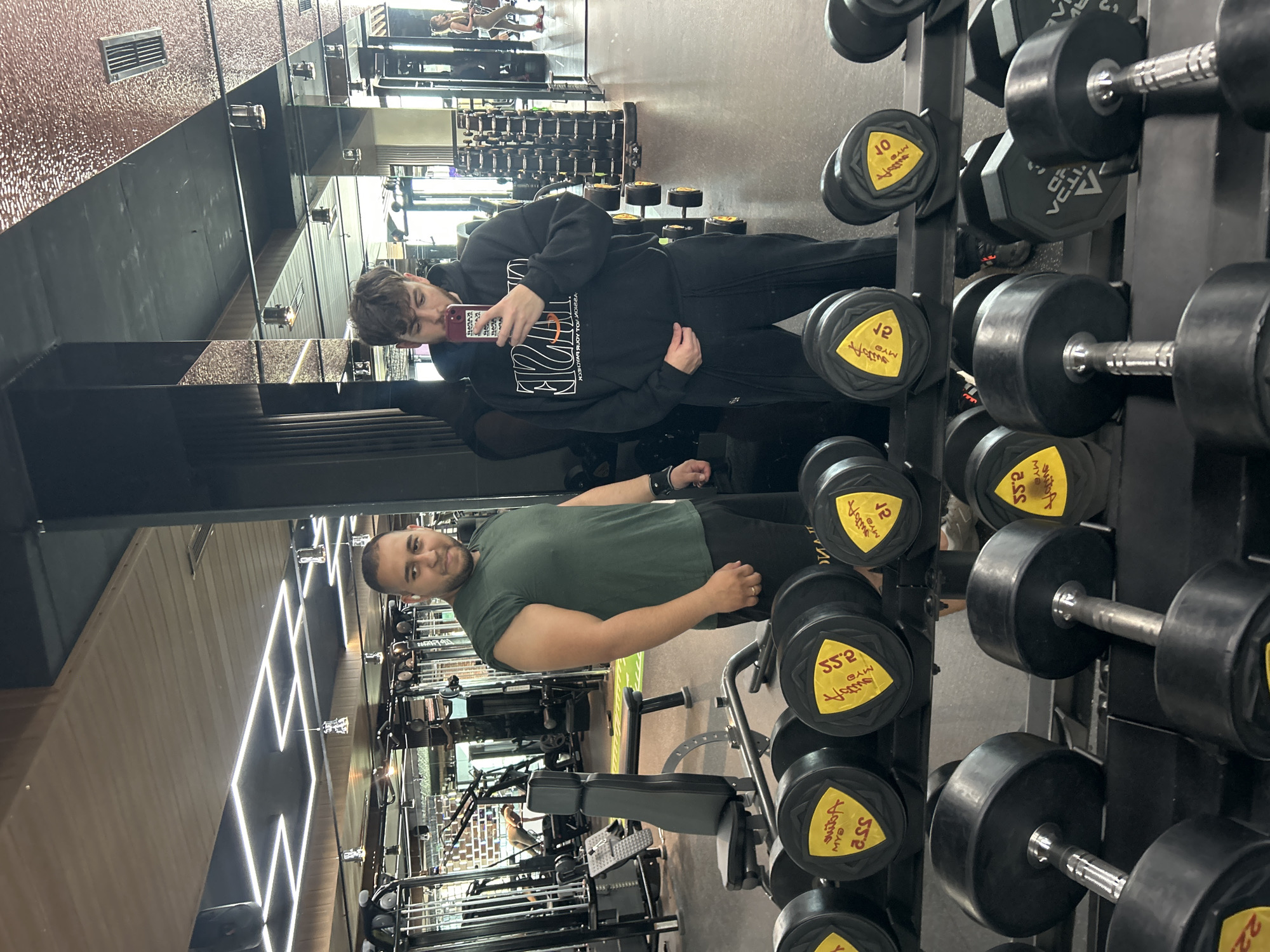 two men taking a photo of themselves in front of a mirror in a gym. The younger man is wearing a black sweatshirt and taking the photo with his phone. He has curly hair. The other man, who is slightly older, is wearing a green t-shirt and is standing to the side of the younger man. Dumbbells are to the right, and more gym equipment can be seen in the background. The location is the city of Sofia, Bulgaria.