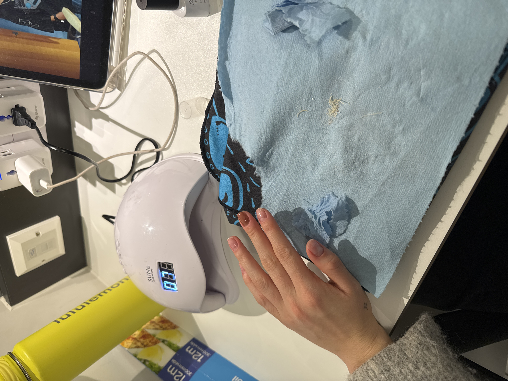 The scene depicts a white desk surface in an indoor setting, located in Hull, United Kingdom. A person's left hand, featuring a small star-like tattoo on the wrist and clad in a grey knitted sleeve, is positioned on a light blue disposable paper towel. The index fingernail is coated with light brown polish, while other nails appear natural or with a clear coat. Scattered white, fibrous debris, consistent with nail dust, rests on the paper towel. Adjacent to the hand is a white SUN® UV LED Nail Lamp, displaying a blue digital timer indicating '0:08'. To the left, a yellow "lululemon" branded water bottle stands next to a partially visible cardboard box marked "12m 300mm wide" and "Foil." In the upper right, a white wall-mounted power outlet is visible. A white multi-port power adapter, branded "Sterren," is plugged in, supplying power to a tablet device, likely an iPad in a clear case, which displays a partial image of a person. A stylus is visible alongside the tablet. A small clear plastic cap and a nail polish bottle with a black cap are also present on the desk. A black object with blue patterns is partially obscured beneath the paper towel.