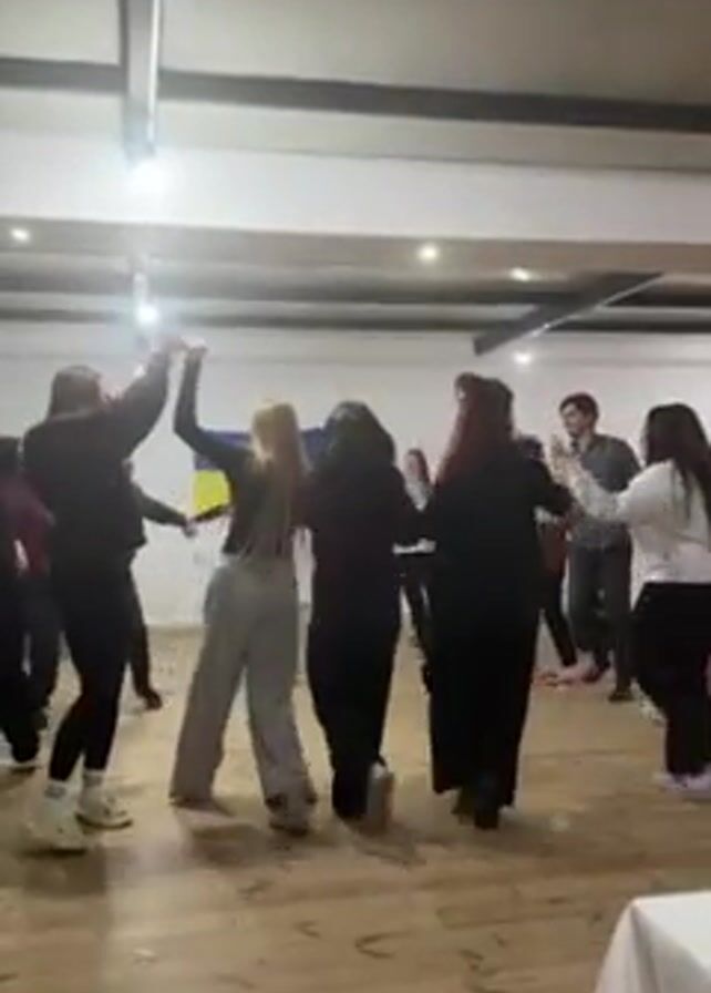 A group of about 15 people are holding hands in a circle and dancing indoors on a wooden floor. They are all facing inward and are wearing casual clothing. Most are wearing black, grey, or white pants and shirts. The room has a high ceiling with exposed metal beams and several lights. There is a table with a white tablecloth in the foreground and a Ukrainian flag on the wall in the background.