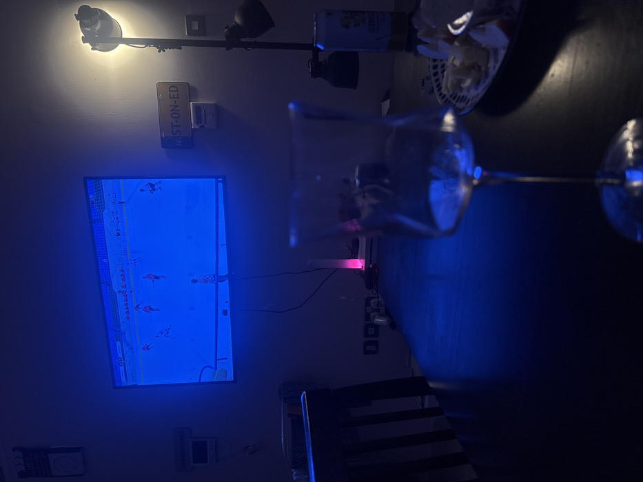 This image displays an indoor domestic setting, likely a living or dining area, in Al Jimi, United Arab Emirates, under dim lighting conditions dominated by a blue hue. In the immediate foreground, a stemmed glass, empty or nearly empty, is prominently positioned and out of focus on a dark, reflective table surface. To its right, a white plate containing several light-colored food items, some with red elements, is partially visible. A large, wall-mounted flat-screen television dominates the central background, displaying what appears to be a video game or televised ice hockey match. The screen shows multiple animated players in red and white jerseys on a blue ice rink, with a player in a black and white striped jersey visible near the bottom center. Black cables descend from the television. To the left of the television, a white rectangular device is mounted on the wall, with another darker object above it. A dark wooden chair back is partially visible in the lower-left corner. To the right of the television, a tall, dark standing lamp with two adjustable heads projects a localized warm yellow light onto the wall. Below the upper lamp head, a metallic object resembling a license plate, bearing partially legible text "ST-ON-ED," is affixed to the wall. Below this, a white electrical outlet or switch plate is visible. A silver beverage can, featuring yellow and blue label elements, stands on the table to the right of the foreground glass, reflecting light from the lamp. A faint, vertical strip of pink and purple light is visible in the mid-ground behind the table. No individuals are directly visible within the scene.
