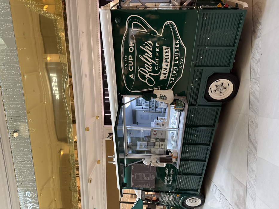 An indoor scene within a luxury shopping mall in Lusail, Qatar, depicts a dark green, vintage-style "Ralph's Coffee" truck