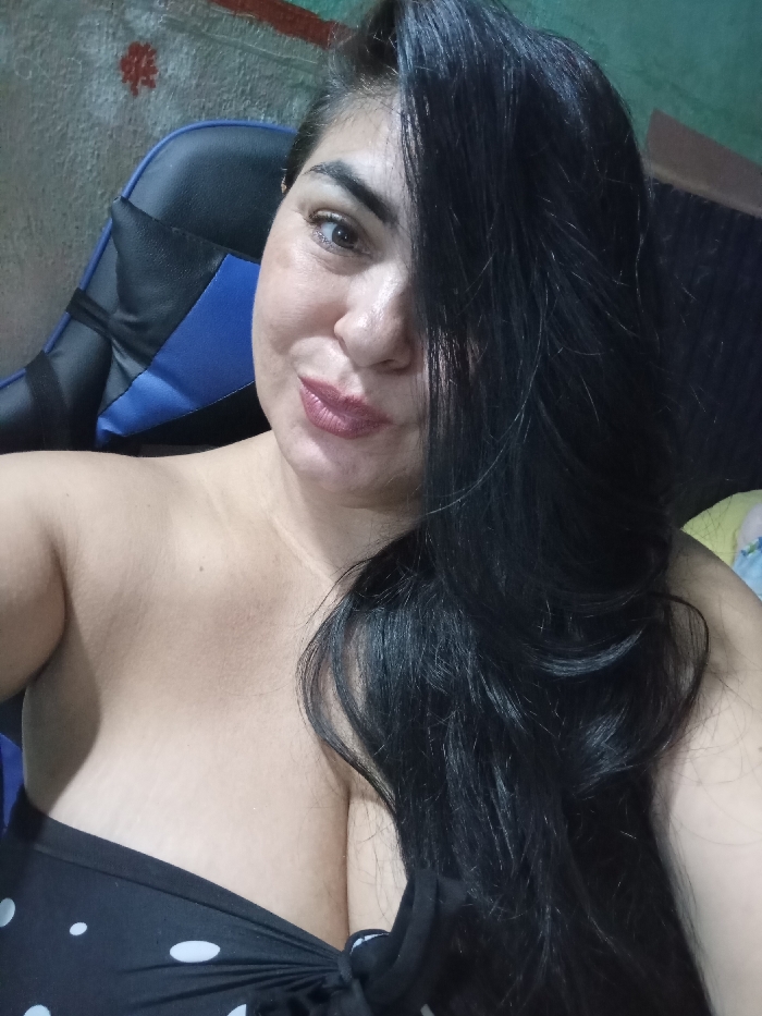 A female individual is depicted in a close-up, eye-level photograph taken indoors. She has long, dark, straight hair, with a portion covering her right shoulder and chest. Her right eye is visible, and she wears reddish-pink lipstick. She is smiling faintly while looking directly into the camera. Her bare shoulders and upper chest are exposed, above a black strapless garment with white polka dots, tied centrally. Behind her left side, a blue and black gaming chair is partially visible. The background consists of a light-colored, textured wall with a faint reddish mark to the upper left, and a dark, padded surface to the upper right. A light-colored patterned object is barely discernible in the far upper right. The location is an indoor room in the city of Unknown, Unknown.
