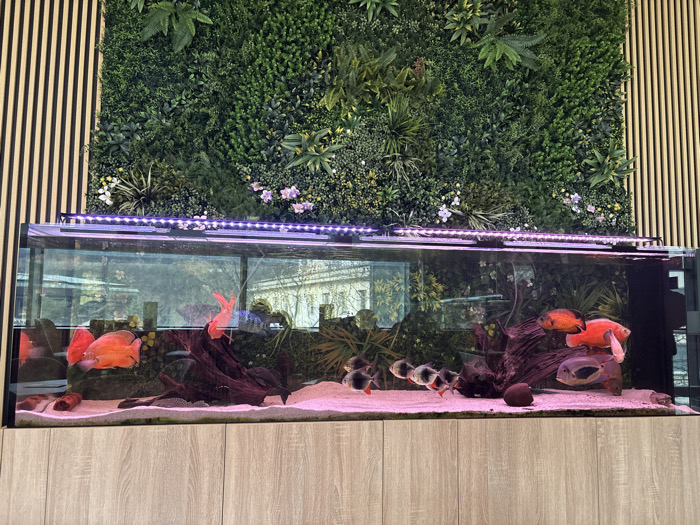 This image depicts an indoor scene in Lovech, Bulgaria, featuring a large aquarium positioned beneath a vertical garden wall