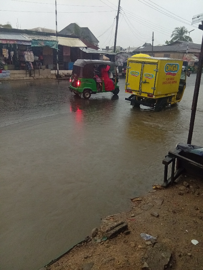 The image captures a street scene in Aba, Nigeria, under an overcast sky, indicating recent or ongoing rainfall