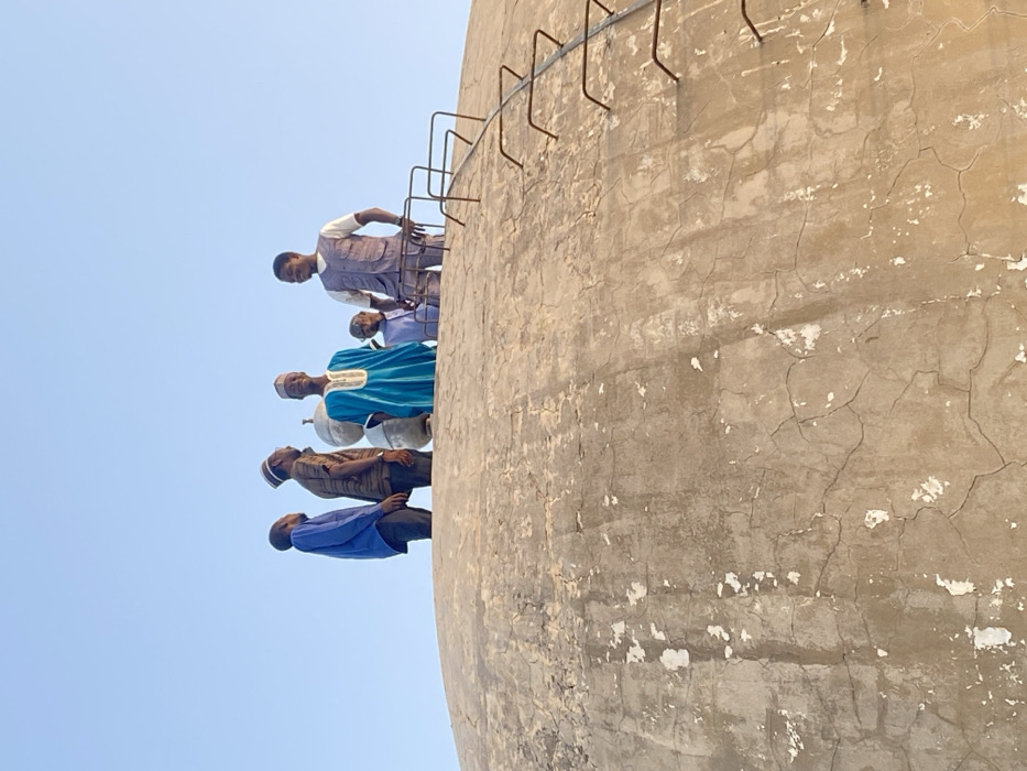 The image depicts six individuals standing on the apex of a large, weathered, concrete or stucco dome structure in Barako, Nigeria
