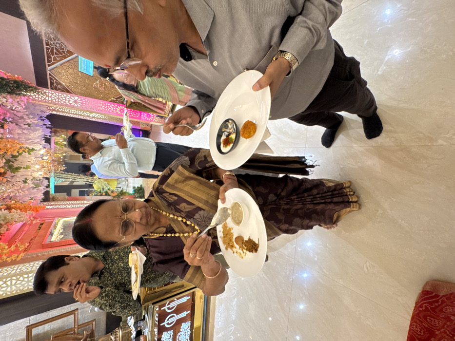 Three people are eating from plates at a buffet. A woman wearing glasses and a patterned brown and gold sari holds a plate with several foods on it. She uses a spoon to eat. Beside her, a man in a green shirt eats. Another man in a gray shirt holds a plate with two foods, using a spoon to eat. Floral decorations and lights are visible in the background. The floor has a shiny, tile-like surface.