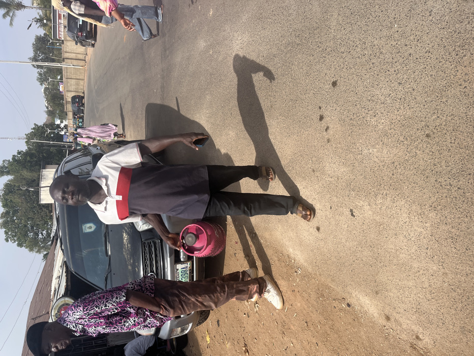 The image displays a daylight street scene in Jos, Plateau State, Nigeria. In the foreground, a bald, dark-skinned adult male walks towards the viewer's left, holding a small pink LPG cylinder in his left hand and a dark-colored smartphone in his right. He is dressed in a white, red, and dark blue polo shirt, black trousers, and brown sandals. His shadow is cast prominently on the light gray asphalt road to his right. To his immediate left, another dark-skinned adult male stands near the front of a dark SUV, partially parked on a reddish-brown dirt shoulder. This man wears a black cap, a patterned purple, white, and black long-sleeve shirt, brown trousers, and white sneakers, with his hands in his pockets. The SUV's front license plate, "PLATEAU G 398 AJ," indicates its registration in Plateau State. The asphalt road continues into the background, where additional vehicles and pedestrians are visible. On the right side of the road, a person in light-colored jeans walks away from the camera, and another individual in a light pink headscarf and dress is visible further down. Structures with corrugated metal roofs line the left side of the street, and a concrete wall runs along the right side further back. The sky is clear and bright.
