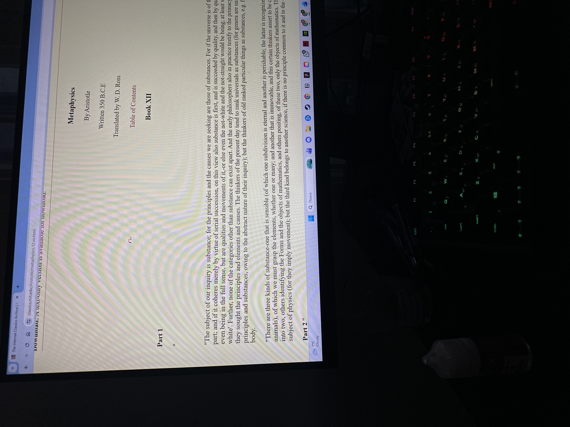 The scene depicts a desk setup in a dimly lit indoor environment, presumed to be in Ramat Gan, Israel. A computer monitor displays a webpage from `classics.mit.edu/Aristotle/metaphysics.12.xii.html`, titled "Metaphysics By Aristotle," written 350 B.C.E. and translated by W. D. Ross. The visible text discusses the subject of inquiry as substance and describes three kinds of substance. The Windows taskbar is visible at the bottom of the screen, featuring a search bar labeled "Поиск" (Russian for "Search"), a weather widget indicating "7°C Cloudy," and multiple application icons including Discord, Spotify, and Steam. In the immediate foreground, a backlit mechanical keyboard is partially visible, with keys illuminated in gradient green on the left and red on the right, suggesting a layout supporting both Latin and Cyrillic scripts. To the left of the keyboard, a clear plastic bottle with a white dropper cap, containing a dark liquid, is present. Behind this bottle, a clear plastic cup with faint, dark text is partially visible. No individuals are depicted.