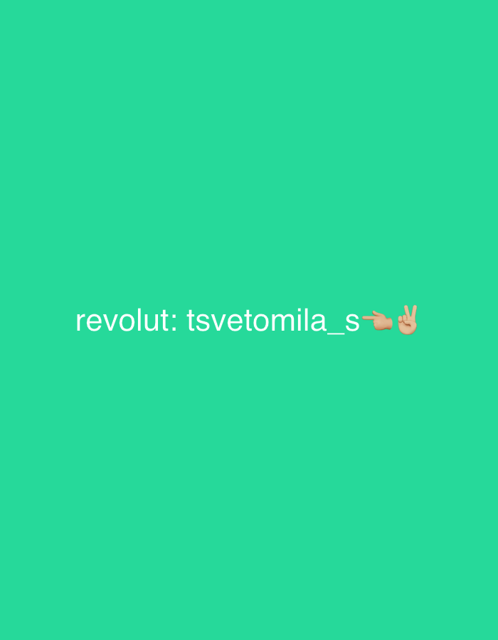 The image displays white text and two emojis centered on a uniform teal background. The text reads "revolut: tsvetomila_s". To the right of the text, a light-skinned hand emoji points right with its index and middle fingers extended, followed by a light-skinned hand emoji forming a V-sign. No visual information is present to describe a physical scene, individuals, objects, actions, or an environment within the city of Troyan, Bulgaria, as the image exclusively features text and graphic symbols on a monochrome background.