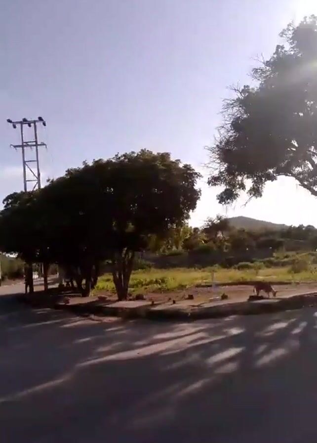 view from a moving vehicle on a paved road. Initially, a dark-colored sedan is parked on the side of the road. As the vehicle moves forward, a dog is visible foraging on the grassy verge beside the road. The scene features scattered trees, a house in the distance, and a hillside under a partly cloudy, sunny sky. Overhead power lines are visible in the background at the start of the video. The video is shot from a low angle, and the phone's watermark "Infinix SMART 8" appears in the bottom left corner.