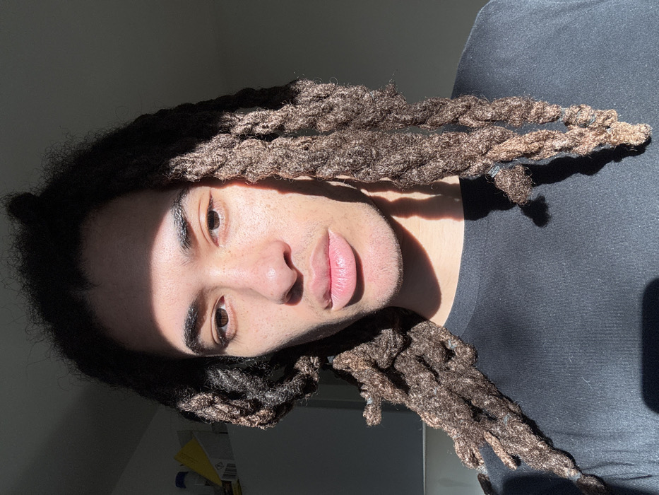 A close-up portrait features an individual with light skin, brown eyes, visible freckles, full lips, and light stubble on the chin and upper lip. The subject has long, dark brown dreadlocks, some with lighter brown hues and small, light-colored bands, framing the face and extending over the shoulders. A portion of the hair is tied up on the top of the head. The individual wears a plain dark t-shirt and maintains a neutral expression while looking directly forward. Strong, direct sunlight illuminates the right side of the subject's face (viewer's left), casting distinct shadows across the left side of the face and neck, as well as on the light-colored wall behind. On the upper left of the background, a white bottle and yellow items are visible on a shelf or surface. This indoor scene is situated in Les Ulis, France.