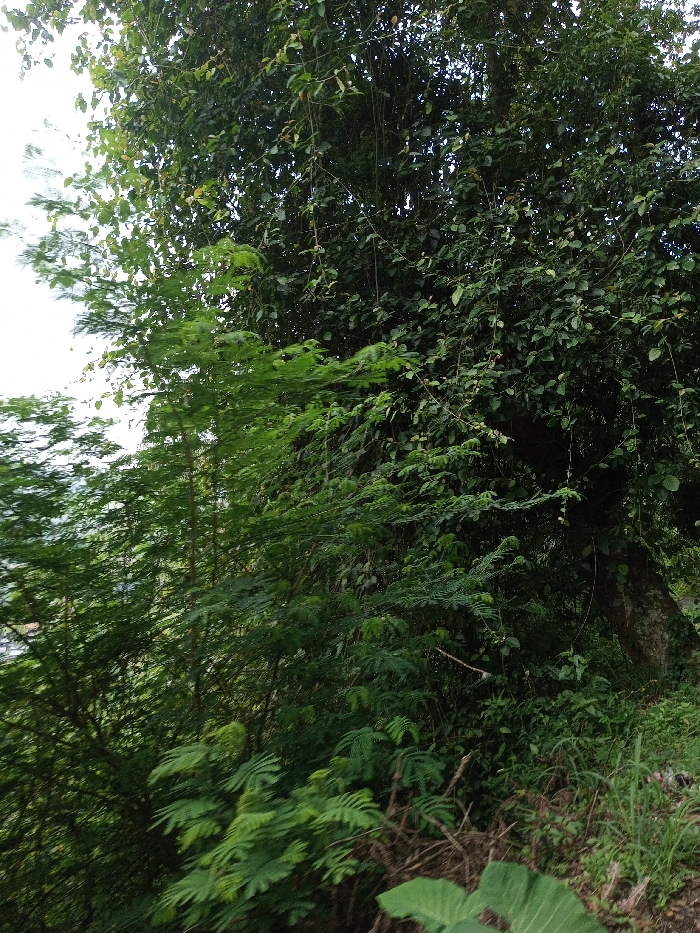 The image displays a dense cluster of tropical vegetation in Matale, Sri Lanka. A large tree with dark green, broad-leafed foliage dominates the upper right and central portions, featuring numerous hanging vines and a visible, gnarled trunk at the bottom right. To the left and in the foreground, lighter green, feathery-leafed plants appear blurred, suggesting either rapid motion or a shallow depth of field. A bright, overcast sky is visible through gaps in the foliage on the upper left. The lower right foreground consists of an earthen bank covered with green grass, dried woody debris, and a prominent broad green leaf. No people, animals, or man-made structures are present within the frame.