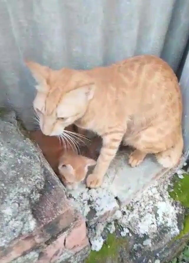 In an eye-level close-up, a light orange tabby cat stands protectively over its kitten. The two are nestled in a corner formed by a grey corrugated metal wall, a weathered rock, and a brick structure with moss growing on it. The adult cat has a concerned expression as it looks at the camera. The kitten, much smaller and also orange, is partially hidden under a rock. The background is simple, highlighting the cats' location and their interaction.
