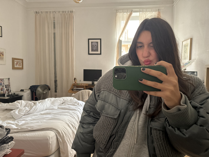 A female individual is depicted in a mirror selfie taken indoors, within a residential room in Marseille, France. She occupies the central-right portion of the frame, from the chest up, winking her right eye and pouting her lips towards the camera. Her long, dark hair is visible. She wears a light grey hooded zipper sweatshirt beneath a dark grey or olive-grey puffer-style bomber jacket featuring ribbed grey sleeves. Her right hand, with dark-painted fingernails, holds a dark green-cased smartphone (identifiable by a triple-lens camera module) pointed towards the mirror to capture the image. The background details a room with white walls and a light-colored ceiling. To the left, an unmade bed with white sheets and a light-colored fitted sheet is visible. A tall window, fitted with light-colored translucent curtains, occupies the central background, revealing indistinct architectural forms of an exterior building. A white standing fan on a pole is positioned to the left of the window, near the foot of the bed. To the right of the window, a dark computer monitor rests on a light-colored desk or shelf, beneath which smaller objects and components are arranged. Multiple framed artworks are mounted on the walls; a dark-framed picture of a skull is prominent on the right wall, and a smaller, lighter-framed picture is on the left wall. The room is brightly illuminated, suggesting natural light from the window.