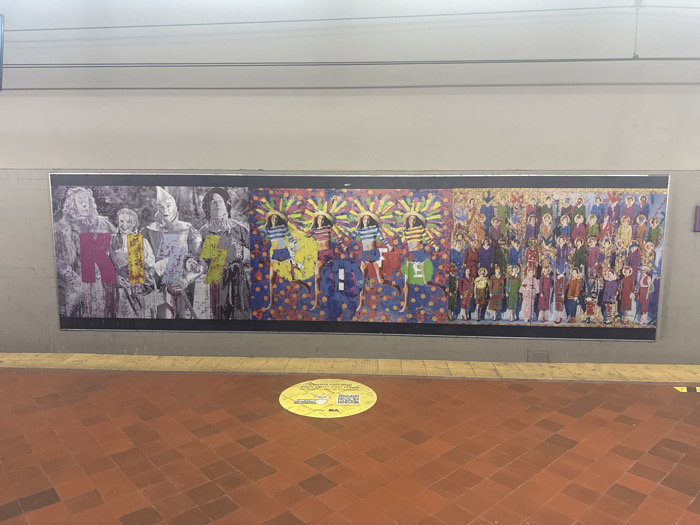 The scene depicts a subway station platform wall at the Juramento station, Line D of the Buenos Aires Subte, Buenos Aires, Argentina. The platform floor is constructed from small, reddish-brown square tiles. A single yellow circular sticker, approximately 0.5 meters in diameter, featuring black text and a QR code, is affixed to the floor in the lower right. The wall above the mural is a plain light gray. Multiple thin, parallel dark lines, likely electrical conduits, run horizontally near the ceiling. The primary subject is a large, elongated mural spanning the majority of the wall. The mural is framed in black and comprises distinct artistic segments: 1. **Left Segment:** Five figures, rendered in a grayscale palette, identifiable as characters from "The Wizard of Oz" (Scarecrow, Dorothy Gale, Tin Woodman, and Cowardly Lion) stand facing forward. A prominent pink capital letter "K" overlays the figures on the far left. A yellow banner with indistinct text is draped across Dorothy and the Tin Woodman. 2. **Mid-Left Segment:** Four stylized female figures are depicted against a vibrant blue background adorned with orange dots. Each figure wears a striped shirt and a colorful skirt, with a radiant, sun-like halo behind her head. A large green capital letter "E" is positioned on the lower body of one figure. 3. **Right Segment:** Numerous small, colorfully dressed figures, resembling children, are densely arranged in multiple rows, filling the rightmost section of the mural. They face the viewer, rendered in a mosaic-like, illustrative style with diverse clothing colors. No people are present on the platform, and no direct actions or interactions are depicted beyond the static imagery within the mural.