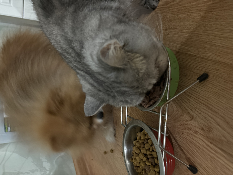 - "In an indoor domestic setting in Chaikovsky, Russia, a grey tabby cat is actively eating dark brown wet food from a green bowl positioned on a silver metal feeding stand" by FM-DSCl32, licensed under CC BY 4.0