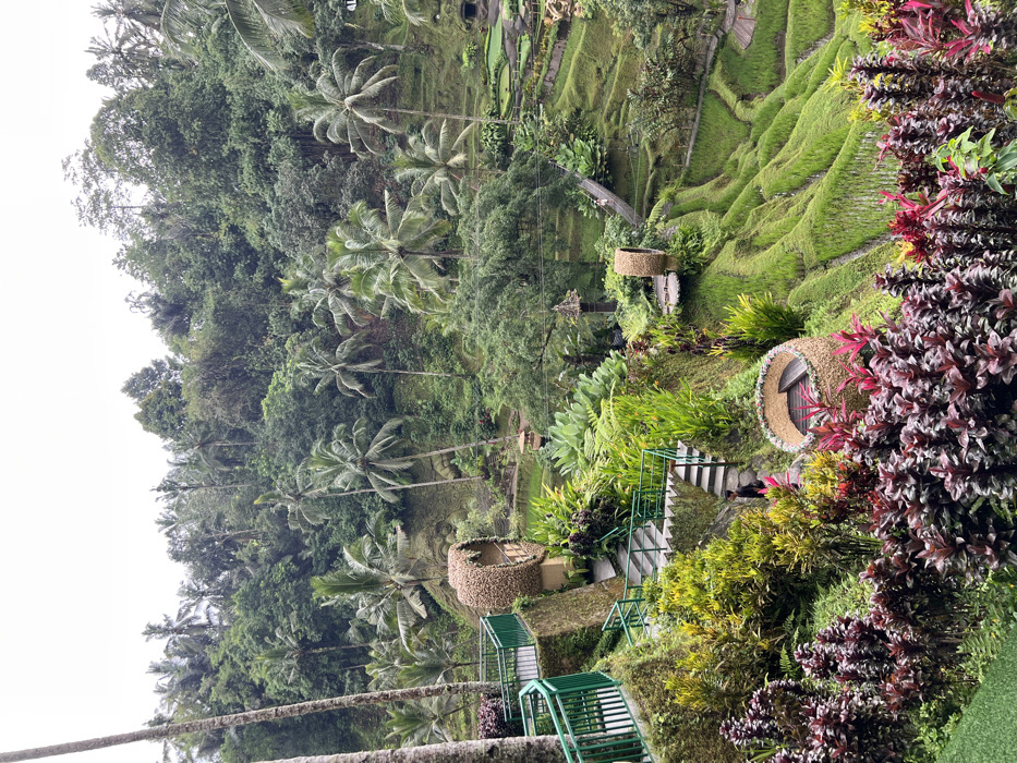 Lush green rice terraces cascade down a hillside dotted with palm trees. Small, round structures resembling nests or huts are nestled among the foliage. A winding staircase with green railings leads down the slope. Colorful plants with red and purple leaves add a splash of vibrant color to the verdant landscape. The scene evokes a sense of tranquility and natural beauty.