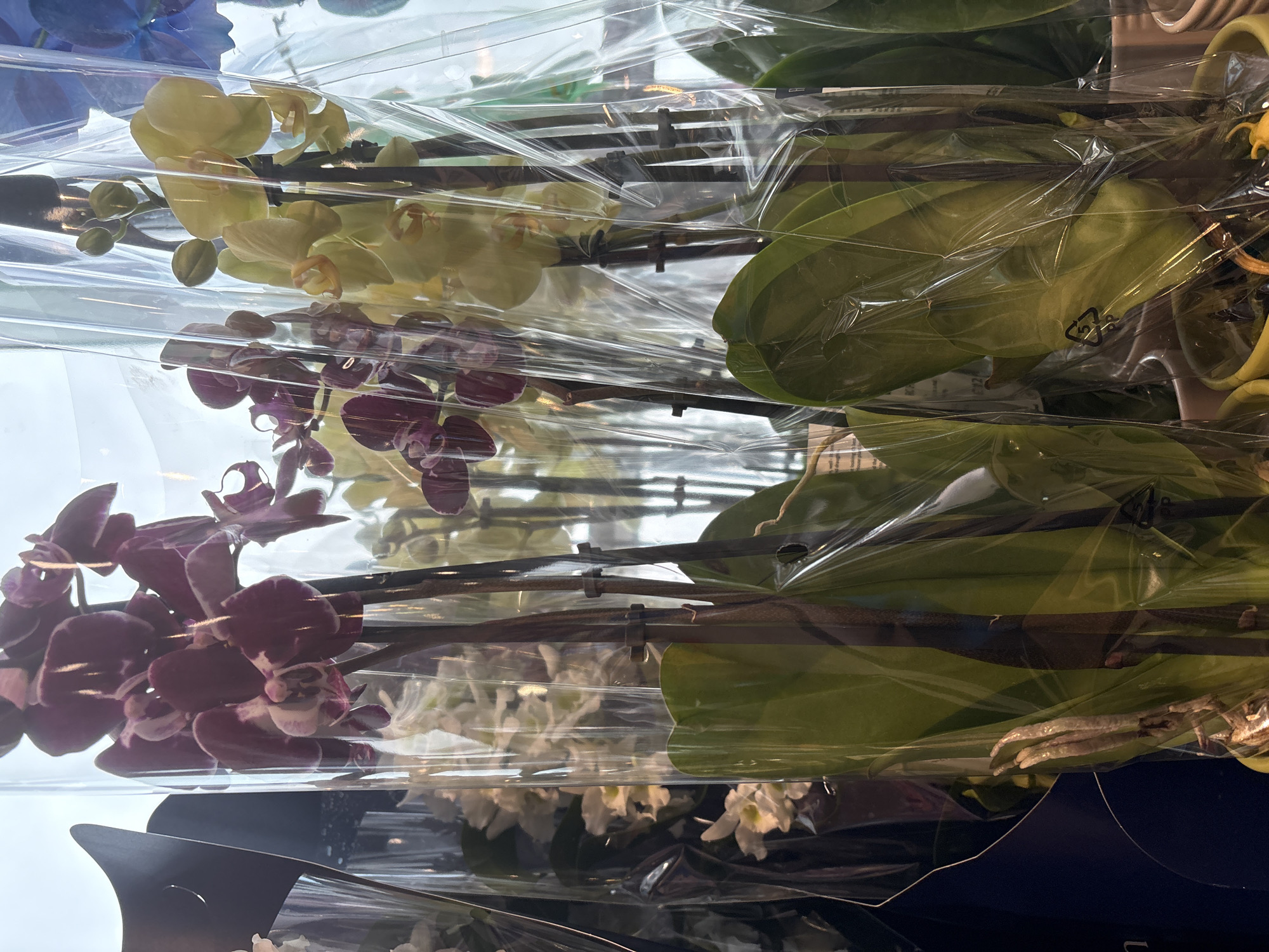 display of orchids, each wrapped in clear plastic