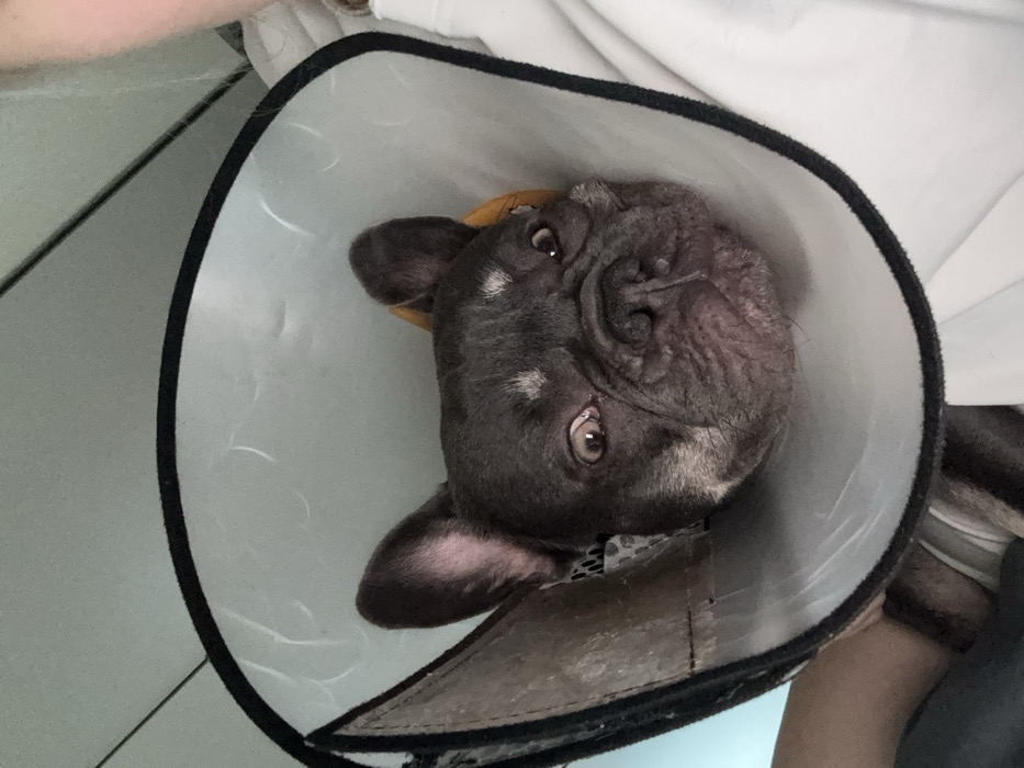 - "A dark grey (blue fawn) French Bulldog, fitted with a clear plastic Elizabethan collar trimmed in black fabric, is depicted in a close-up, head-on view" by FM-lu45y2, licensed under CC BY 4.0