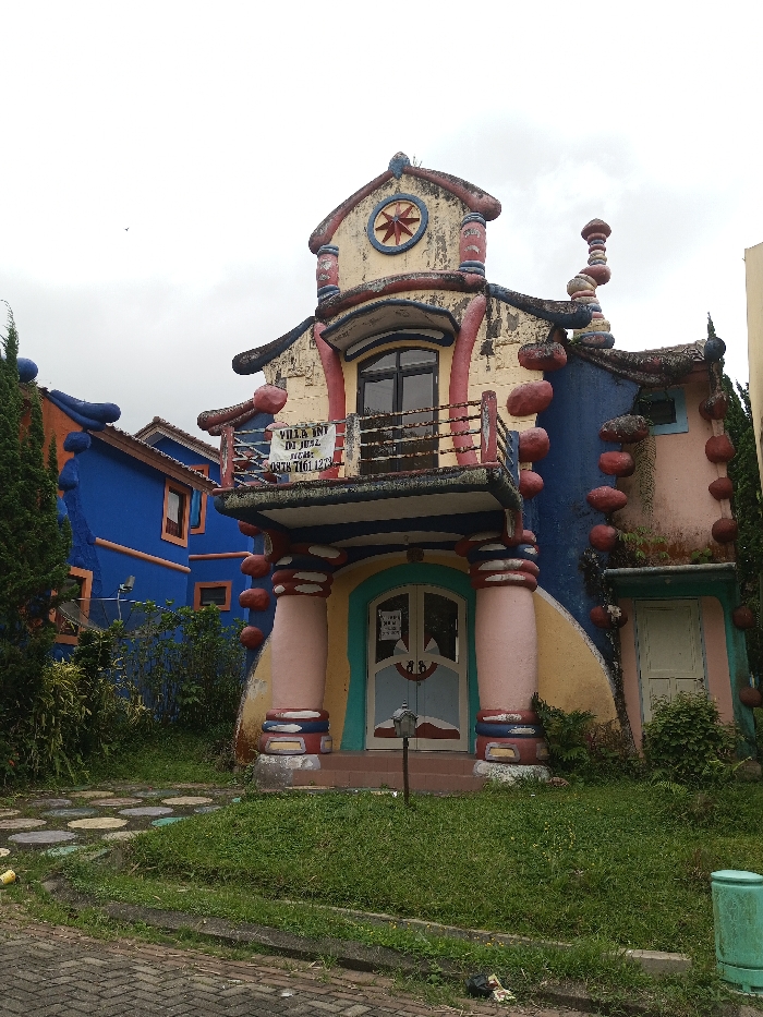 A whimsically designed two-story building exhibits a mix of architectural styles, featuring bulbous, colorful elements