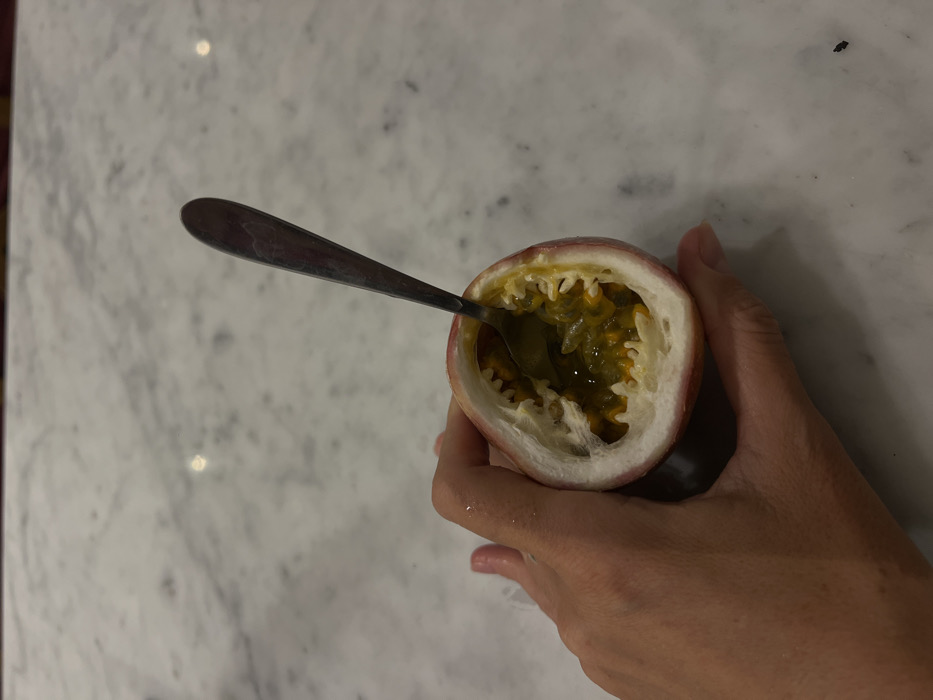 - "A human hand with light skin tone holds a halved passion fruit against a light-colored, veined marble surface" by FM-37mOy1, licensed under CC BY 4.0