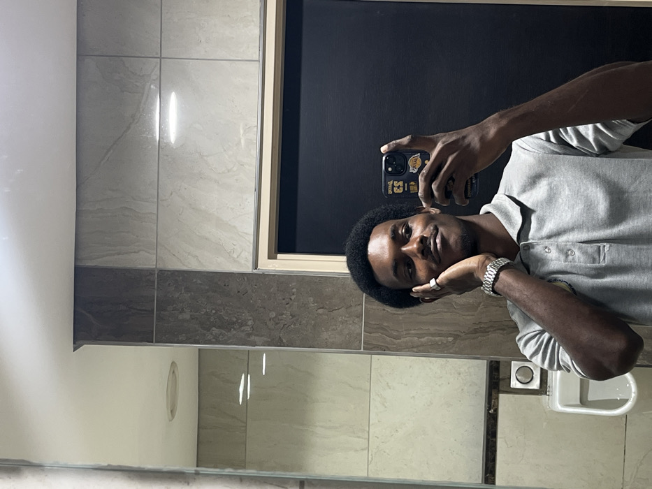 - "The image displays an adult male, with dark skin and dark, curly hair, taking a mirror selfie in a restroom in Mile 11, Ghana" by FM-w5W832, licensed under CC BY 4.0