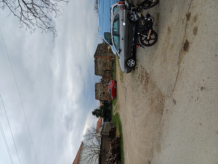 This image depicts an outdoor scene in Prdejci, North Macedonia, under an overcast sky. The foreground features a dark asphalt surface with visible oil stains, transitioning into a dirt and gravel area in the midground. On the right side of the asphalt, two black motorcycles with some reddish-brown accents are parked, one facing left, the other partially obscured behind it. A dark grey hatchback car, possibly a Seat Ibiza, is parked on the dirt/gravel surface to the left of the motorcycles, facing right. Further back, a light blue panel van is parked behind the grey hatchback. In the left midground, a stack of wooden pallets is visible next to a low wall. Behind this, a white building with an orange tiled roof is partially visible. In the background, two prominent, partially collapsed stone and brick structures, appearing as ruins, stand centrally. To their left, a red compact car is parked on a dirt path leading into the distance. Bare tree branches are visible in the top right and left portions of the frame, and power lines span across the top of the image against the grey sky. No individuals are present or engaged in any actions within the visible scene.