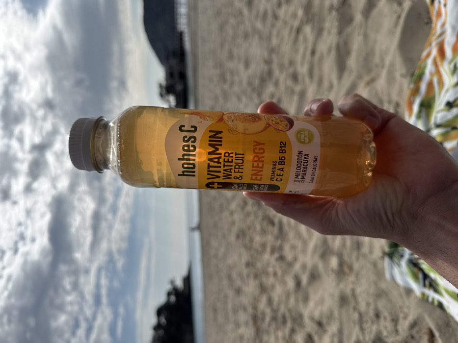 The image depicts a human hand holding a clear plastic bottle of "hohes C Vitamin Water & Fruit ENERGY" with a peach and passionfruit flavor on a sandy beach in Es Camp De Mar, Spain