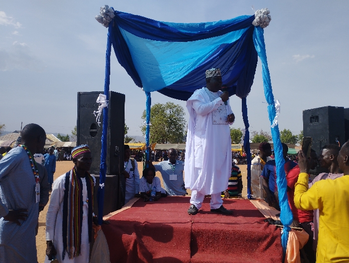 man in a white robe and a blue cap standing on a stage and addressing a crowd in Chum, Nigeria. He is holding a microphone and speaking. There are two large speakers on either side of the stage, and a canopy with blue and white fabric is draped over the stage. The stage is decorated with a red carpet. The man is standing on a stage with a red carpet and is surrounded by people. Some people are holding their phones up to record the speaker. There is a crowd of people listening to the speaker. The crowd is mostly men and children. There are some trees and a few buildings in the background. The weather is sunny and clear.
