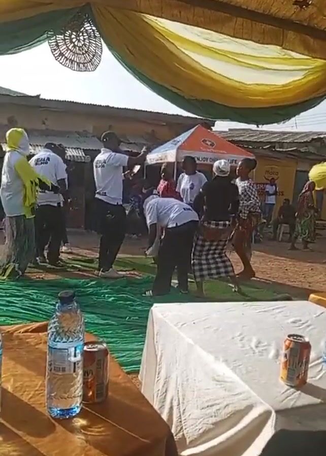 group of people dancing outdoors, likely at a celebration. There's a crowd of people watching. There's a green and white net on the ground where the dancing is taking place. A table is in the foreground with water bottles and cans on it. The area is covered with a white and yellow tarp and a branded tent is visible in the background. People in the video are dressed in casual clothes. A person is seen pinning money on another person's clothing.