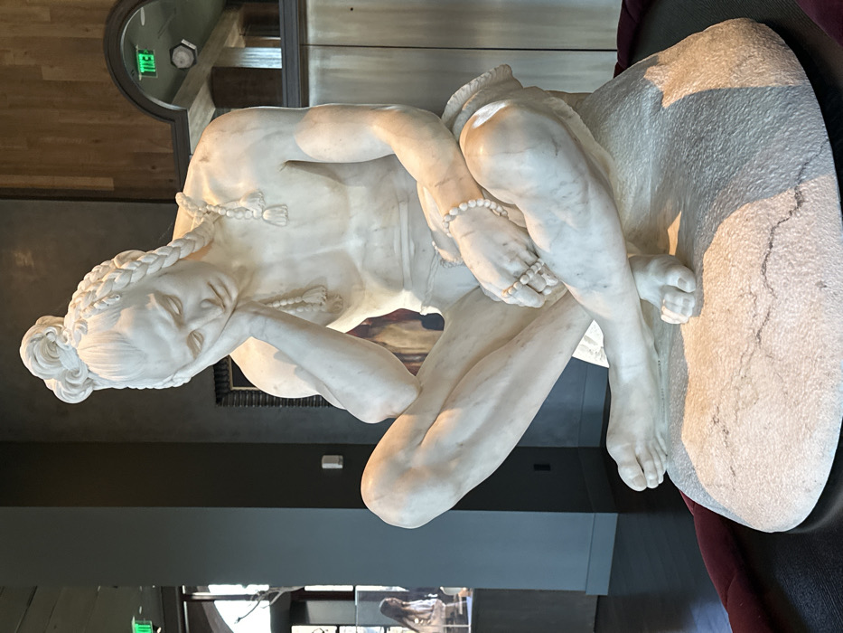 A marble statue depicts a reclining figure with a contemplative pose. The person has their head resting on one hand, with their body partially draped over a rough-hewn stone base. Braided hair adorns the head, and beaded strands are visible on the body. The statue showcases detailed musculature and anatomy, capturing the essence of classical sculpture. The backdrop includes wooden and gray panels, with an illuminated exit sign visible near the top left corner.