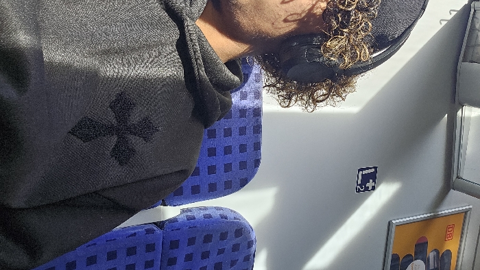 An upward-angled, close-range view captures a partial scene inside a passenger train car, specifically identified as operating in or near Kamenz - Kamjenc, Germany. The primary subject is an individual, visible from the chest up and facing left, with the right side of their head and upper body shown. This individual possesses tightly curled, light brown or blonde hair and wears black over-ear headphones. They are clad in a dark gray or black hooded sweatshirt, on the left chest area of which is a prominently embroidered black cross design. Strong diagonal sunlight enters from an unseen window, casting distinct shadows across the white wall behind the subject and on their sweatshirt. The train's seating, partially visible to the right and behind the subject, features a blue fabric with a repeating dark blue checkered pattern. On the white wall, a small blue and white sign marked "L+2" is affixed. Above and to the right of this sign, a framed yellow poster with the "DB" (Deutsche Bahn) logo is partially visible. No other individuals or explicit actions beyond the individual being seated are discernible.