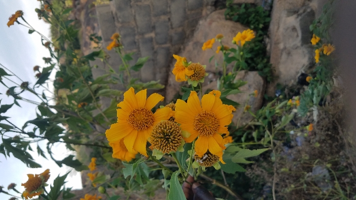 - "The image displays a close-up of several yellow Mexican sunflowers (Tithonia diversifolia) with prominent orange-brown disc florets and green foliage dominating the foreground" by FM-rFkQ43, licensed under CC BY 4.0