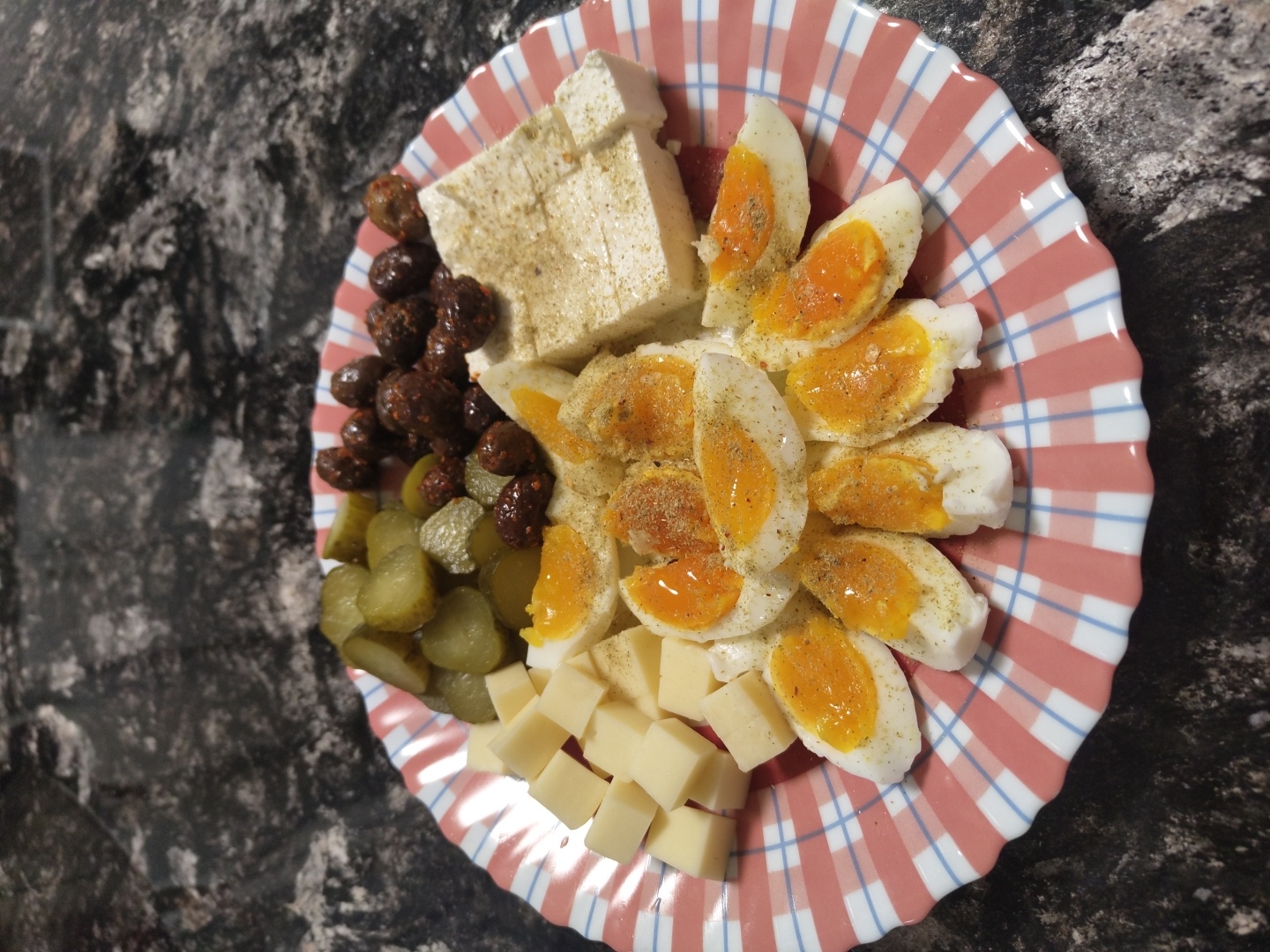 The scene depicts a prepared meal or appetizer situated on a dark, mottled granite or marble countertop within the city of Tutrakan, Bulgaria. A round, ceramic plate with a scalloped edge features a red and white checkered pattern overlaid with subtle blue lines, forming a plaid design. The plate holds various food items arranged in sections: In the top-left quadrant, a pile of sliced green pickles is visible. Adjacent to the pickles, a cluster of dark, reddish-brown olives, many coated in a dry spice mixture, is present alongside some lighter green olives. To the right, a block of white, rectangularly cut, crumbly cheese, seasoned with dark specks of dried herbs or pepper, is arranged. The lower half of the plate is filled with numerous halves of medium-boiled eggs, showcasing bright orange-yellow yolks, heavily seasoned with black pepper and green dried herbs. To the left of the eggs, a small mound of light yellow cheese cubes is positioned.