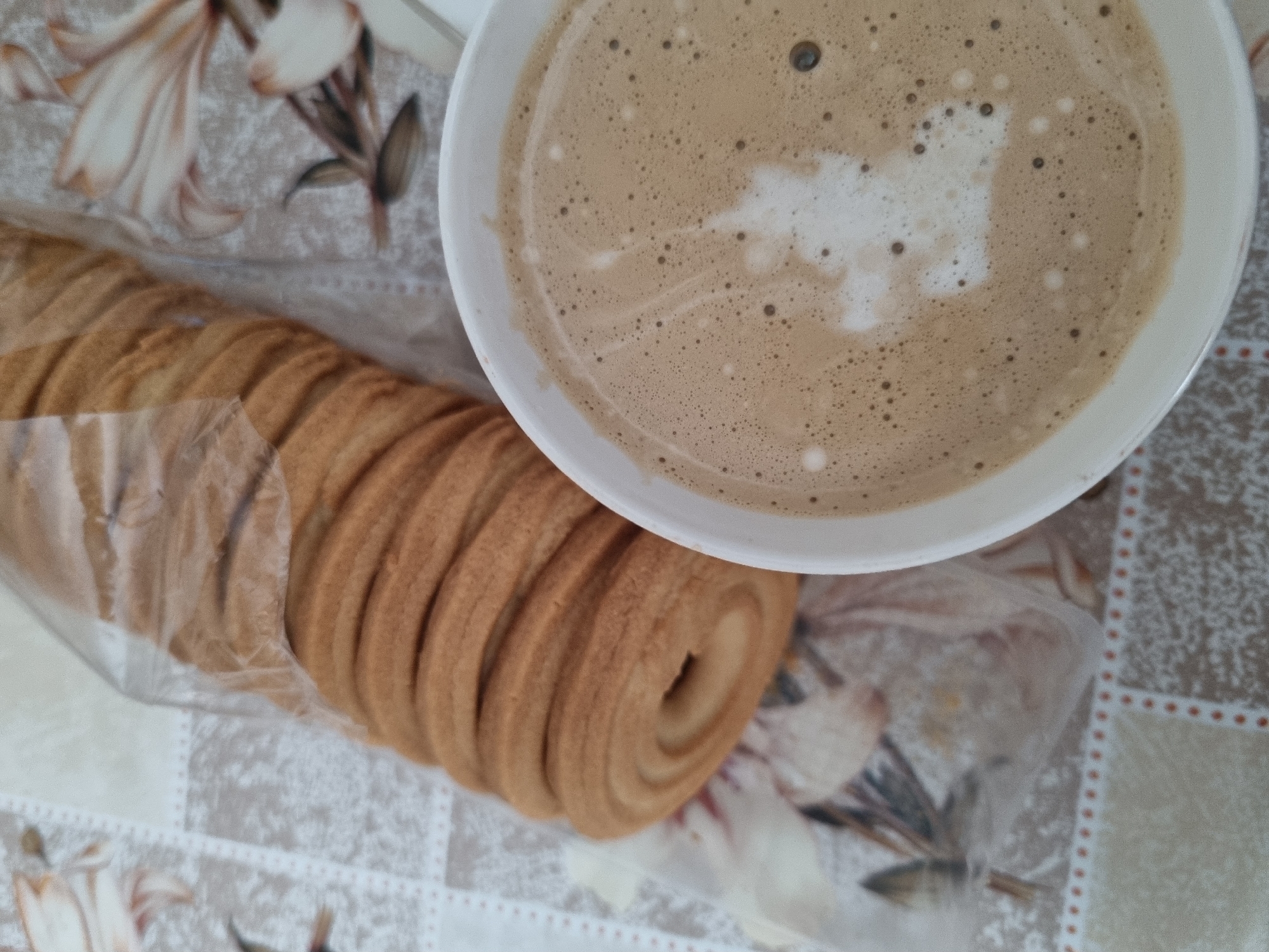 A top-down shot shows a cup of coffee with foamy latte art next to a roll of cookies still in its plastic wrapping. The table is covered with a floral-patterned tablecloth with a grid design. The setting appears to be indoors. There is no evidence to suggest that this image was taken in Gorna Oryahovitsa, Bulgaria.
