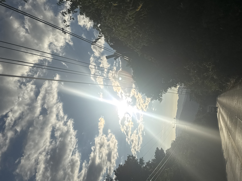 A sun-drenched road stretches ahead, flanked by dense greenery on the right and telephone poles on the left. Power lines crisscross the sky, partially obscured by fluffy white clouds. The sun shines intensely, creating a bright glare and silhouetting distant mountains in a soft, hazy light. The asphalt reflects the sunlight, adding to the overall brightness of the scene.