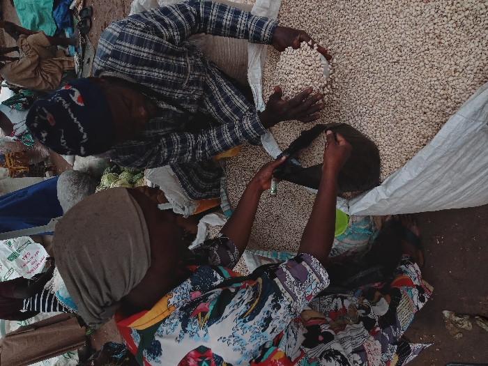 This image depicts an outdoor market scene in Kujama, Nigeria. Two individuals are engaged in handling large quantities of light-colored, dried legumes, likely cowpeas. The person on the left, wearing a multi-patterned shirt and a beige head covering, is actively scooping the legumes from a large, open white sack into a smaller black pouch. The person on the right, wearing a blue plaid shirt and a dark blue knitted cap, holds a substantial amount of the same legumes in their cupped hands, seemingly inspecting or preparing them. A second large white sack filled with legumes is visible. A green plastic bowl is partially seen on the dirt ground between the two individuals. The background features blurred figures, various market goods, and blue fabric coverings, indicative of a bustling market environment.