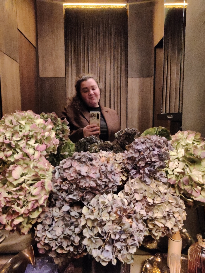 The image depicts a mirror selfie taken within an interior space of an establishment in Unknown, Unknown. One individual, a person with dark, curly hair, is visible in the reflection. They are wearing a dark brown blazer over a dark, horizontally striped top and holding a smartphone with a light-colored case in their right hand, angled towards the mirror to capture the image. The person exhibits a subtle smile. The foreground is dominated by a dense, extensive arrangement of numerous large hydrangea flower heads. These flowers display muted and faded hues, predominantly shades of green, pink, purple, and cream. Some appear to be partially dried. In the bottom right corner, partially obscured by the floral display, are a gold-colored metallic dish and a glass diffuser bottle containing reeds, resting on a surface. The environment behind the individual consists of modern interior architectural elements. The walls feature textured panels in varying shades of brown and beige. A strip of warm, yellowish ambient light runs horizontally along the upper wall section. Dark, vertically textured drapery is reflected in the upper portions of the mirror, suggesting a window or decorative feature beyond the visible wall panels.
