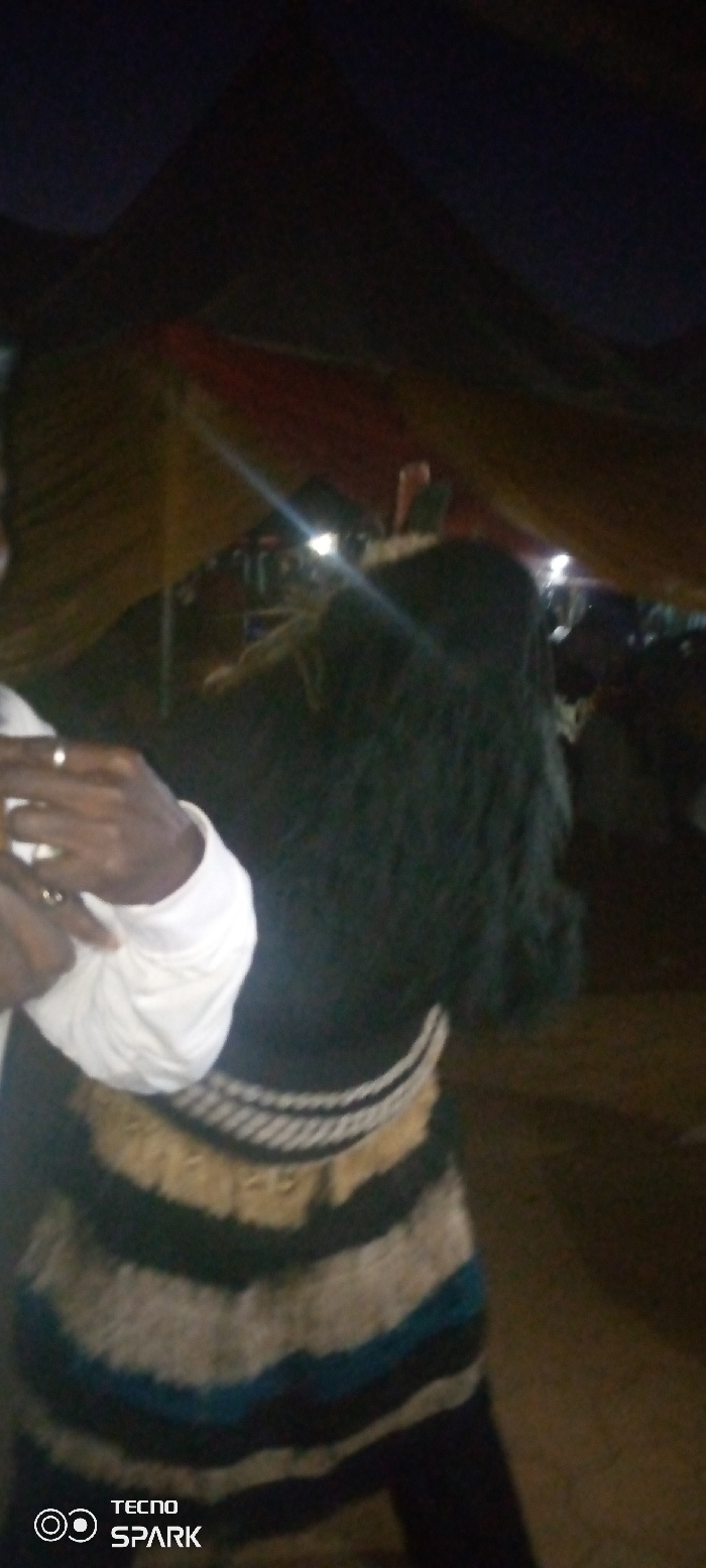 A dark, blurry image depicts a nocturnal gathering within a sheltered environment in Unknown, Unknown. The scene is illuminated by sparse artificial light sources. In the left foreground, the partial upper body of an individual is visible, featuring dark skin, a white long-sleeved shirt, and a dark outer layer. Their right hand, adorned with a ring, holds a small, light-colored object. Dominating the central mid-ground from behind, a second individual is seen with long, dark, textured hair. They wear a garment featuring horizontal stripes of dark blue/black, light blue, and beige/light brown, topped by a patterned band across the upper back. The background is indistinct, showing dark silhouettes of multiple people and several bright, small light points. A large, dark, fabric structure, possibly a tent or canopy, spans the upper portion of the background. The image is marked with a "TECNO SPARK" watermark in the bottom left.