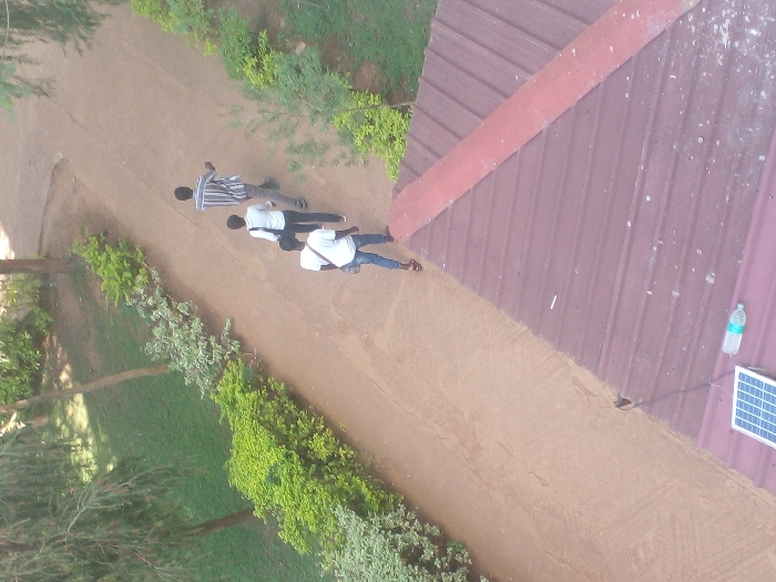 Three people are walking along a dirt path next to a building with a metal roof. One person wears a striped shirt, another wears a white shirt, and the third person wears a white shirt and carries a bag. Green trees and bushes line the path. A water bottle and solar panel are positioned on the roof. The scene appears to be taken from an elevated perspective.