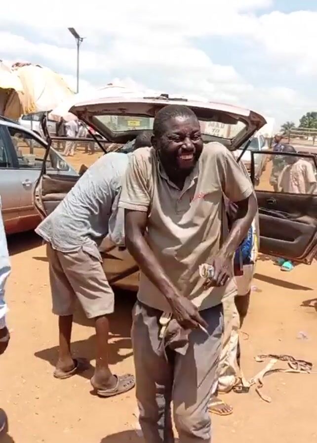 group of men around a car in an outdoor setting that appears to be a marketplace or parking area. The trunk of the car is open, and men are loading items into it. One man stands in the foreground, smiling and seemingly celebrating, holding cash in his hands. Other men are focused on loading luggage and other items into the car. The environment includes other vehicles, a few tents or canopies, and people in the background, suggesting a busy public place. The ground is reddish-brown, implying the presence of soil or a dirt road.