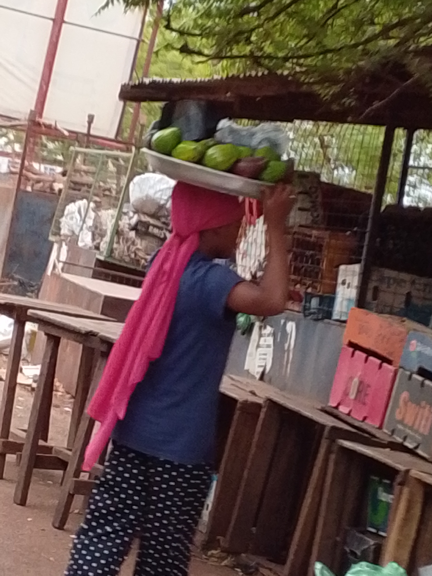 In Dungu, Ghana, a person is carrying a tray of what appears to be avocados on their head. The person is wearing a red headscarf, blue shirt, and dark pants with white polka dots. They are standing in a market or street vendor area, indicated by tables, wooden crates with painted labels, and other items. The background shows a corrugated metal roof and some vegetation.