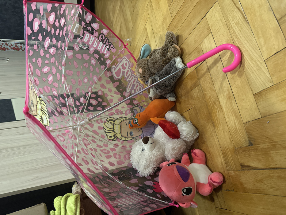An indoor scene displays five stuffed animals positioned on a light brown wooden parquet floor, laid in a herringbone pattern. They are arranged beneath an open, inverted child's umbrella. The umbrella features a transparent plastic canopy with pink leopard print, pink trim, and pink text graphics including "Barbie," "BABBIE CHIC," and "DOLL," alongside an illustration of a blonde "Barbie" doll. The umbrella's shaft is silver-colored metal, and its curved J-handle is pink, resting on the floor. From left to right, the stuffed animals consist of a pink 'Stitch' character with a white belly and purple inner ears, a white fluffy bear holding a red heart-shaped object, an upright orange elongated creature with distinct eyes, and two smaller, less distinct brown and grey furry animals lying together. The background reveals a partial view of a light-colored wooden wardrobe or cabinet with vertical grain, and a darker object. A folded light green towel or fabric is visible on a surface to the far left. No people are present. The precise location within the city of Ruse, Bulgaria, cannot be identified from the visual evidence.