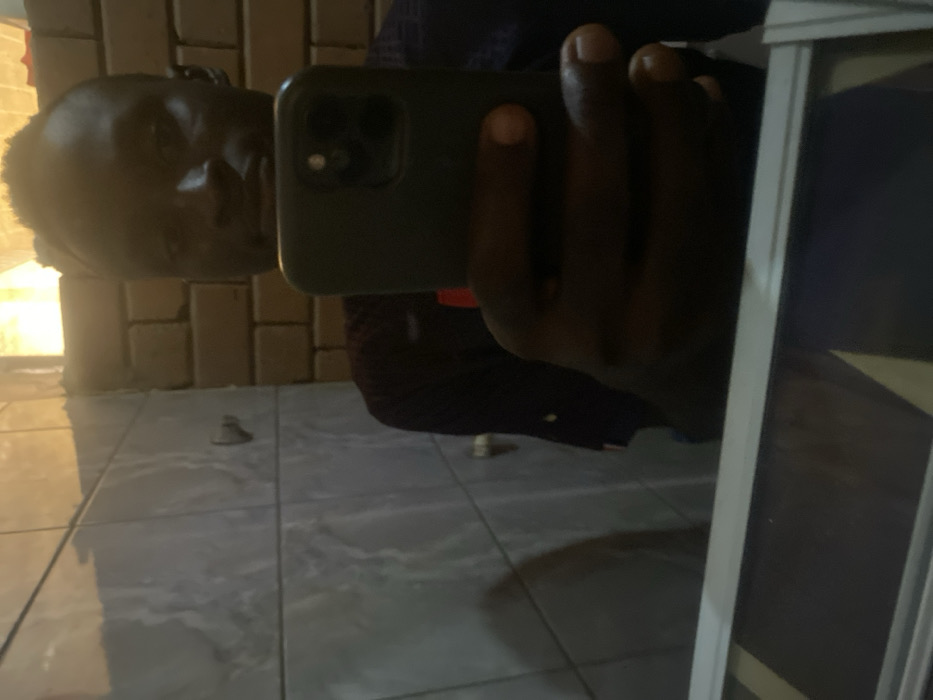 An individual with dark skin is depicted taking a mirror selfie indoors in Barden Yana, Nigeria