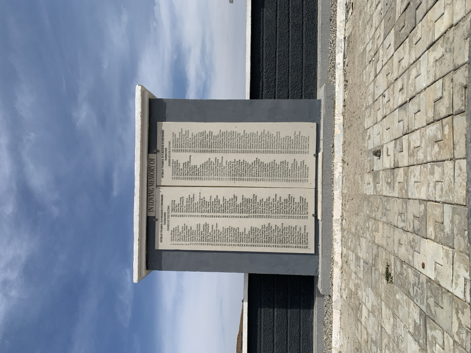 This image depicts a standalone memorial structure under a bright, partly cloudy blue sky