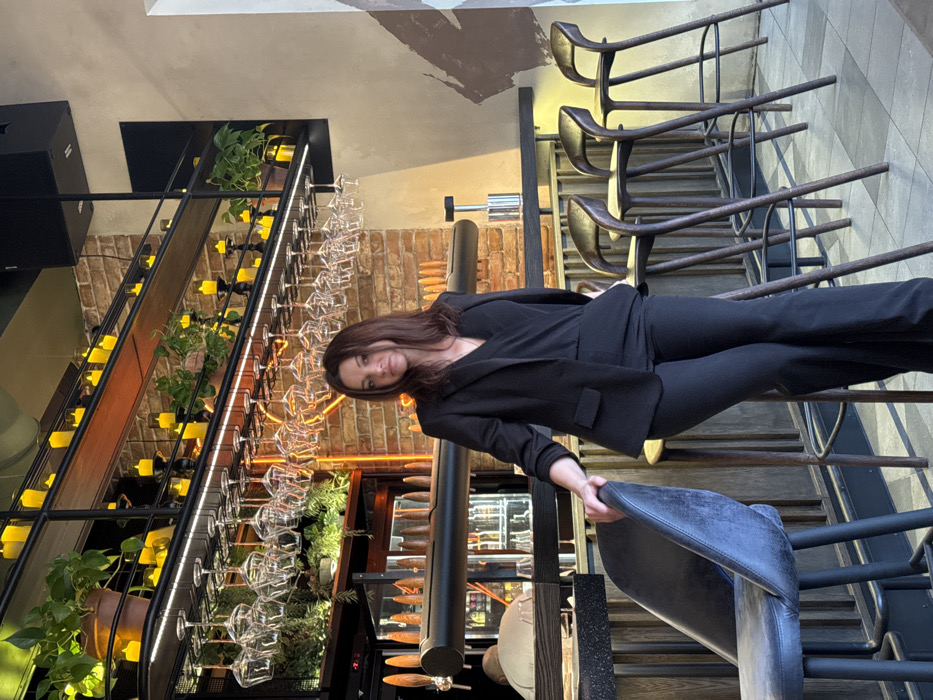 A female subject, with dark brown, shoulder-length hair, stands centrally in an indoor establishment, identified as a bar or restaurant