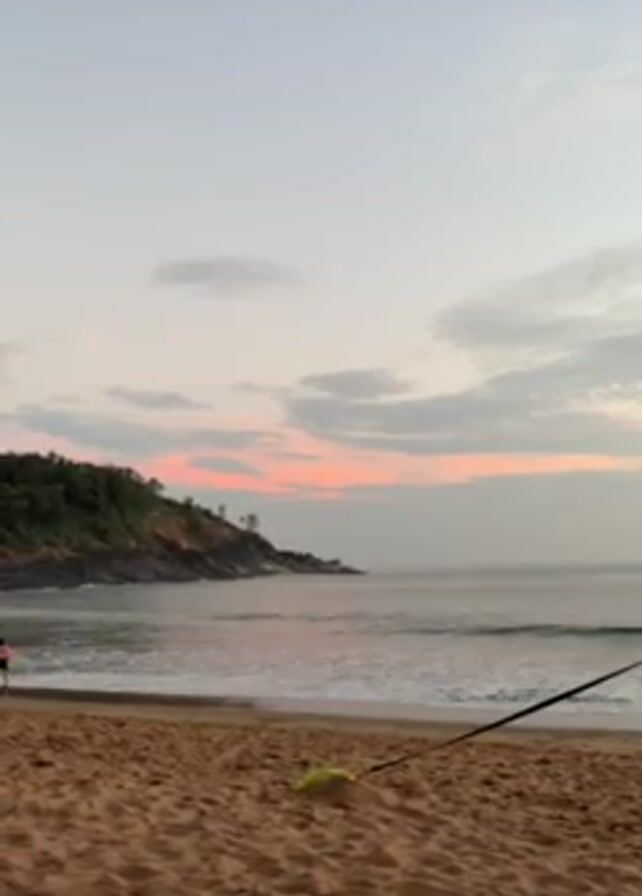 beach scene at dusk or dawn. The sand is a reddish-brown color. Gentle waves roll onto the shore. A headland covered in trees juts out into the ocean on the left side of the frame. In the distance, the sky is a pale pink and grey, suggesting either sunrise or sunset. A person is faintly visible walking on the beach near the water's edge on the left side. A black leash is stretched from the foreground to the water. A green ball or toy sits on the sand in the lower left.