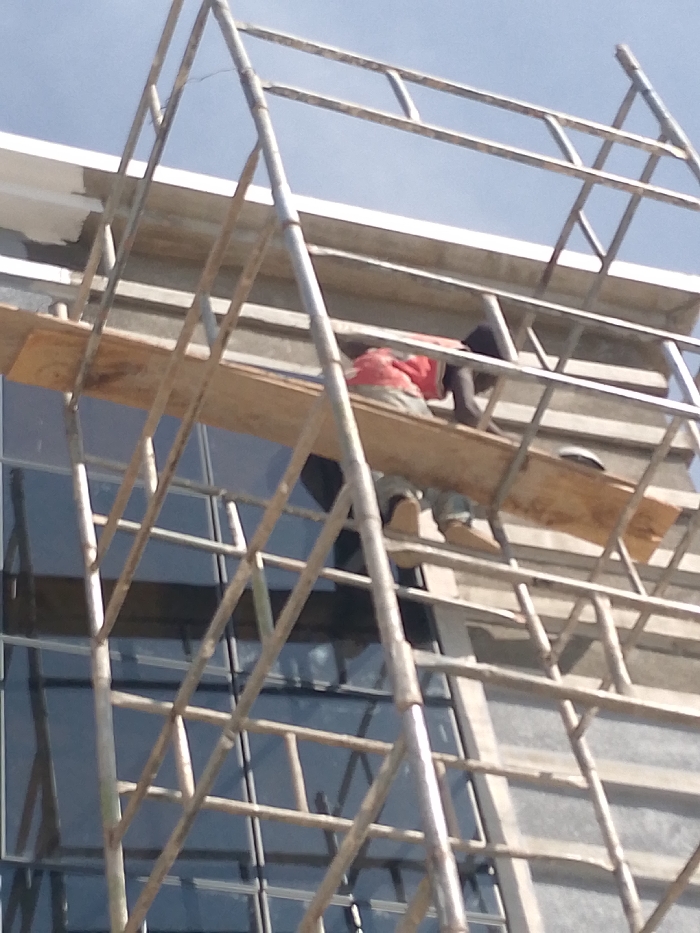 The image depicts a construction scene in Kwang, Nigeria, featuring a worker on scaffolding against a blue sky. A single individual, dressed in a red upper garment and light-colored trousers, is crouched on a horizontal wooden plank that serves as a platform. This plank is secured within a metallic, grid-patterned scaffolding structure that dominates the foreground and midground. The worker's right arm is extended towards the building's exterior, suggesting active engagement with the structure. The building itself, visible behind the scaffolding, features dark, reflective window panels on its lower section and a light-colored upper facade, partially painted white near the top left. The overall scene is illuminated by daylight under a clear sky.