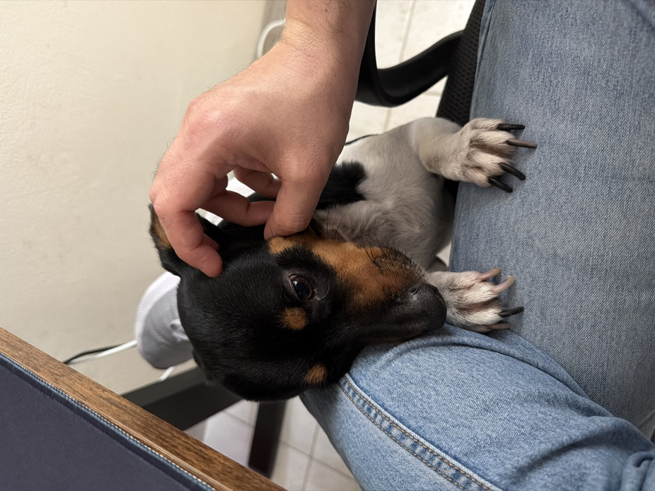 A small dog, mostly black with tan eyebrows and nose, rests on a person's lap. The dog's body is grey and white. A human hand is touching the dog's head. The person is wearing blue jeans and sitting in a black office chair. The scene is indoors with neutral wall color and hints of office furniture. The dog's claws are visible, indicating it's lying sideways on the lap.